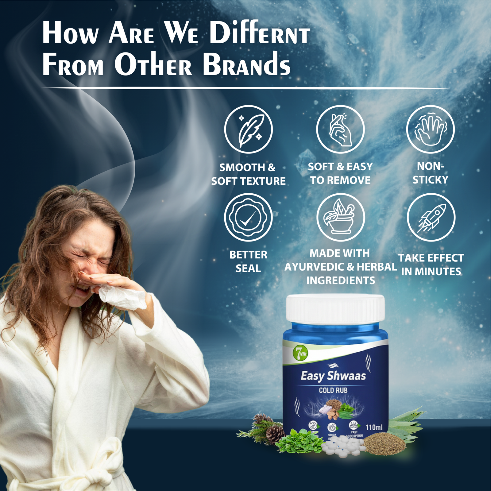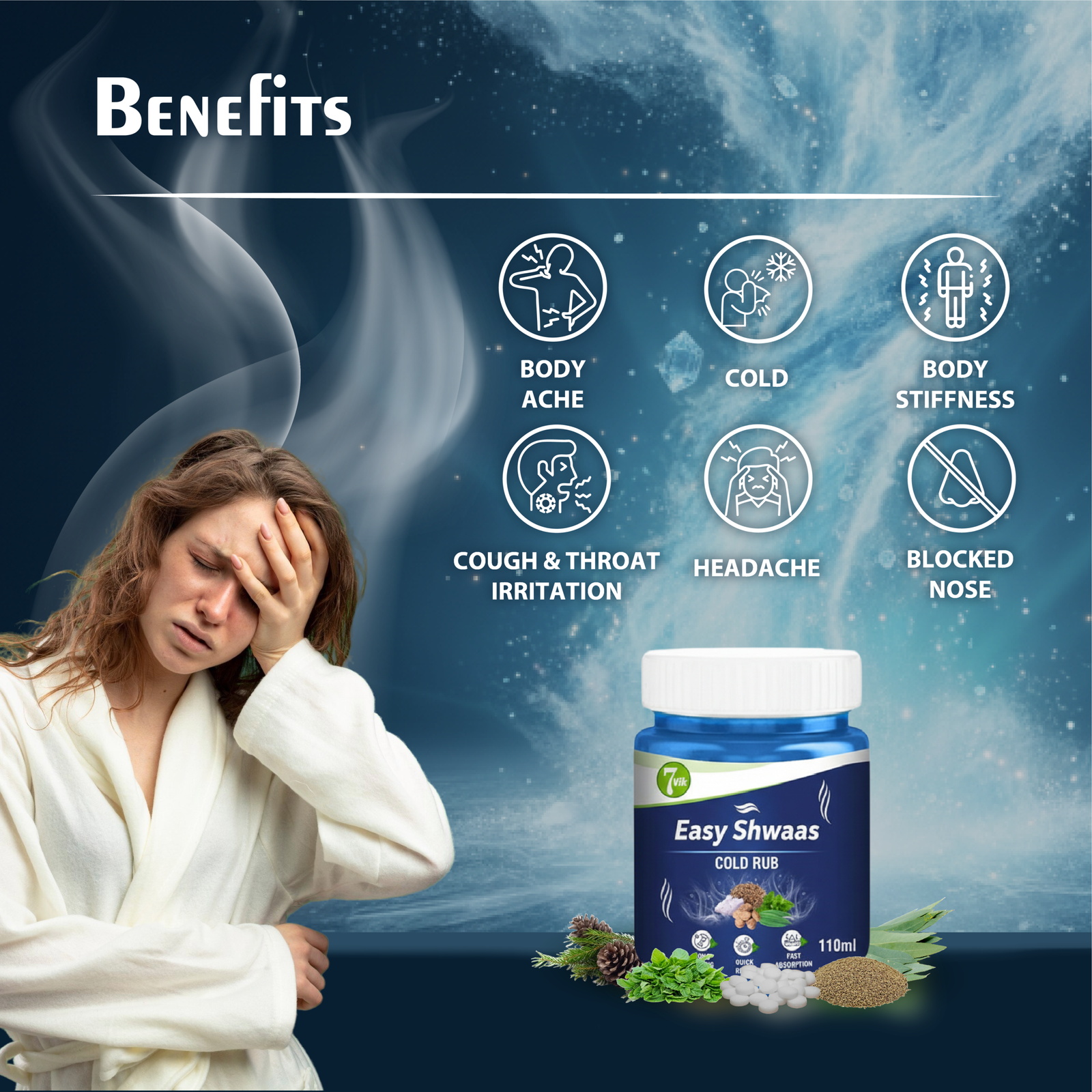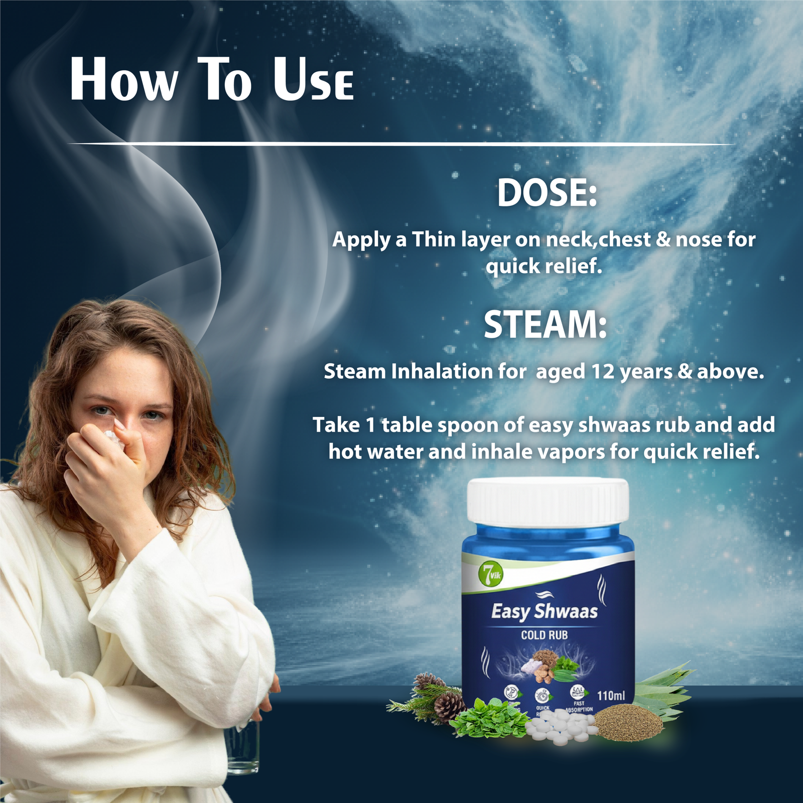 Don’t let cold and cough restrict your life. Breathe freely with 7vik Easy Shwaas and get effective relief from 6 problems through this one effective ayurvedic balm.